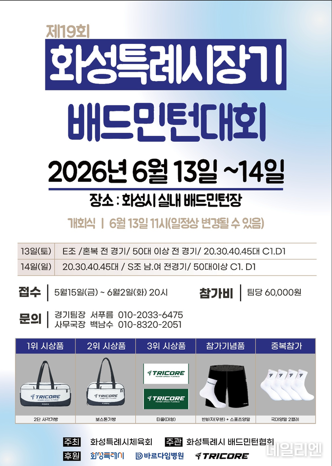 화성특례시배드민턴협회는 ‘제19회 화성특례시장기 배드민턴대회’를 6월 13~14일 화성시 실내배드민턴장에서 개최한다.