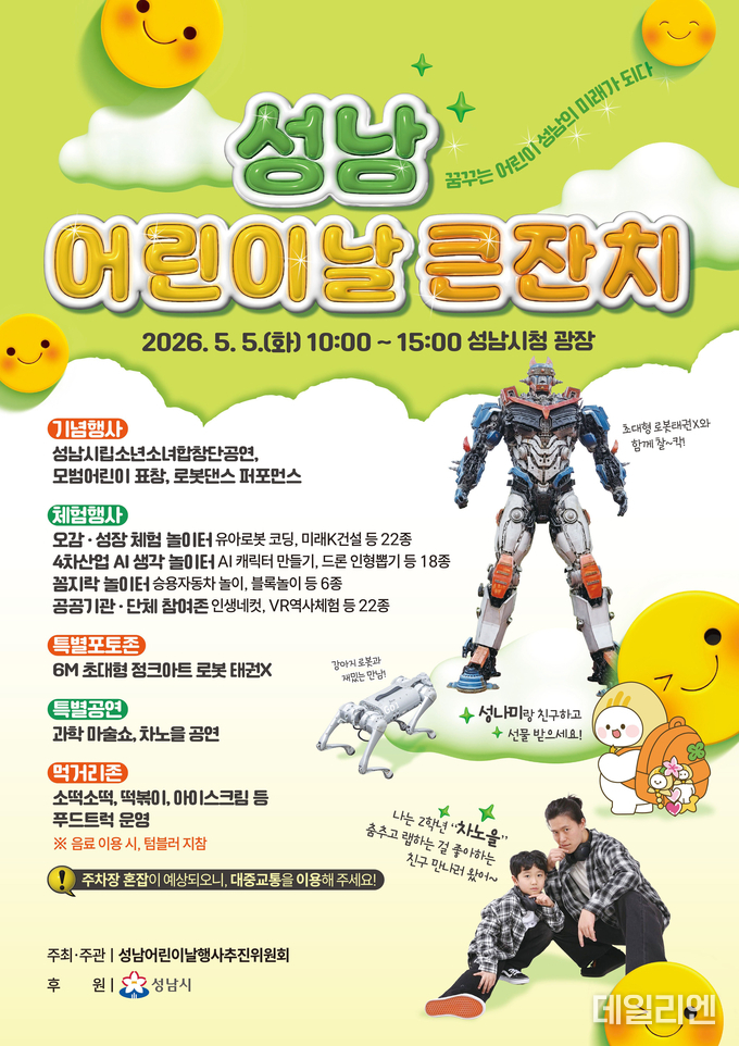 [데일리엔뉴스 이종성 기자] 성남시가 어린이날인 5월 5일 시청 광장과 1층 온누리에서 로봇 체험과 공연, 놀이 부스 등 87개 프로그램으로 꾸린 ‘어린이날 큰잔치’를 개최한다.