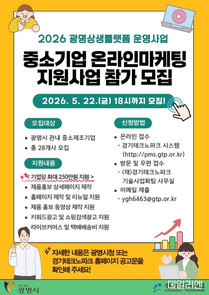 시는 ‘2026년 광명시 중소기업 맞춤형 온라인 마케팅 지원사업’에 참여할 기업을 오는 5월 22일까지 모집한다.