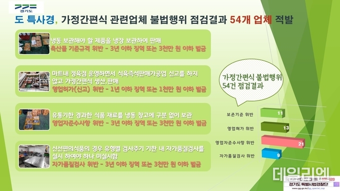 경기도특별사법경찰단은 2월 21일부터 3월 4일까지 도내 가정간편식 불법 제조․판매업체 360개소를 점검한 결과 식품위생법과 축산물위생관리법을 위반한 54개 업소를 적발했다고 21일 밝혔다.