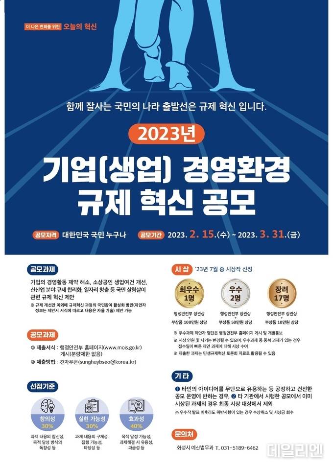 [데일리엔뉴스 유석주 기자] 화성시가 행정안전부와 함께 ‘기업(생업) 경영환경 규제 개선과제’를 오는 3월 31일까지 모집한다.