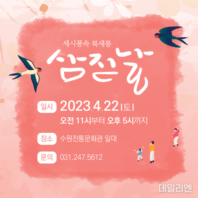 먼저, 수원전통문화관에서는 오는 22일 음력 3월 3일 삼짇날을 맞아 세시풍속-북새통 ‘삼삼한 삼짇날’을 진행한다. 삼짇날과 삼삼하다(잊히지 않고 눈에 선하다)는 의미를 담아 시민들이 마스크 없이 오랜만에 맞이하는 일상의 봄을 만끽할 수 있도록 다양한 프로그램을 준비했다.