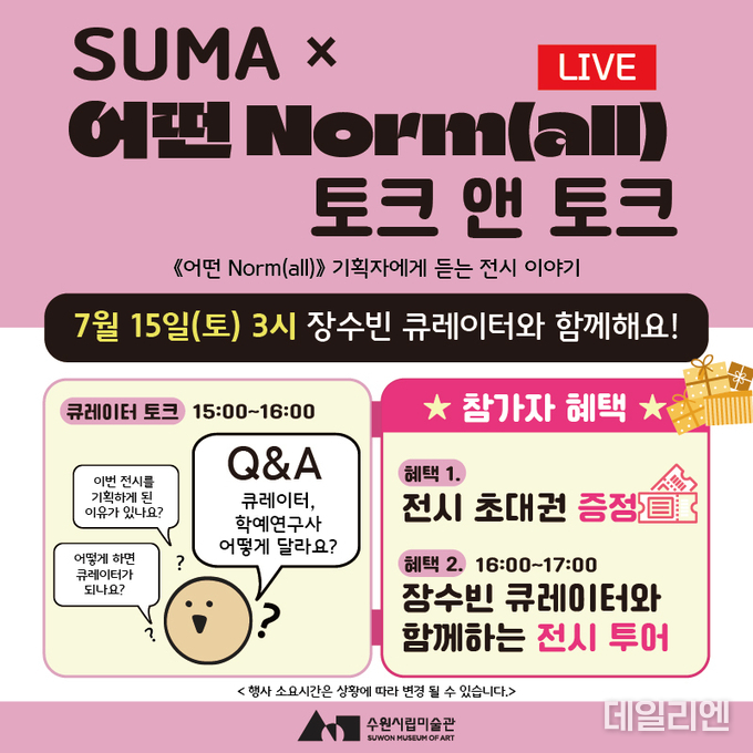 [데일리엔뉴스 이종성 기자] 수원시립미술관(관장 홍건표)은《어떤 norm(all)》전시와 연계한 두 번째 강연 프로그램 <《어떤 Norm(all)》 × 토크 앤 토크〉를 7월 15일(토) 오후 3시 수원시립미술관에서 개최한다.