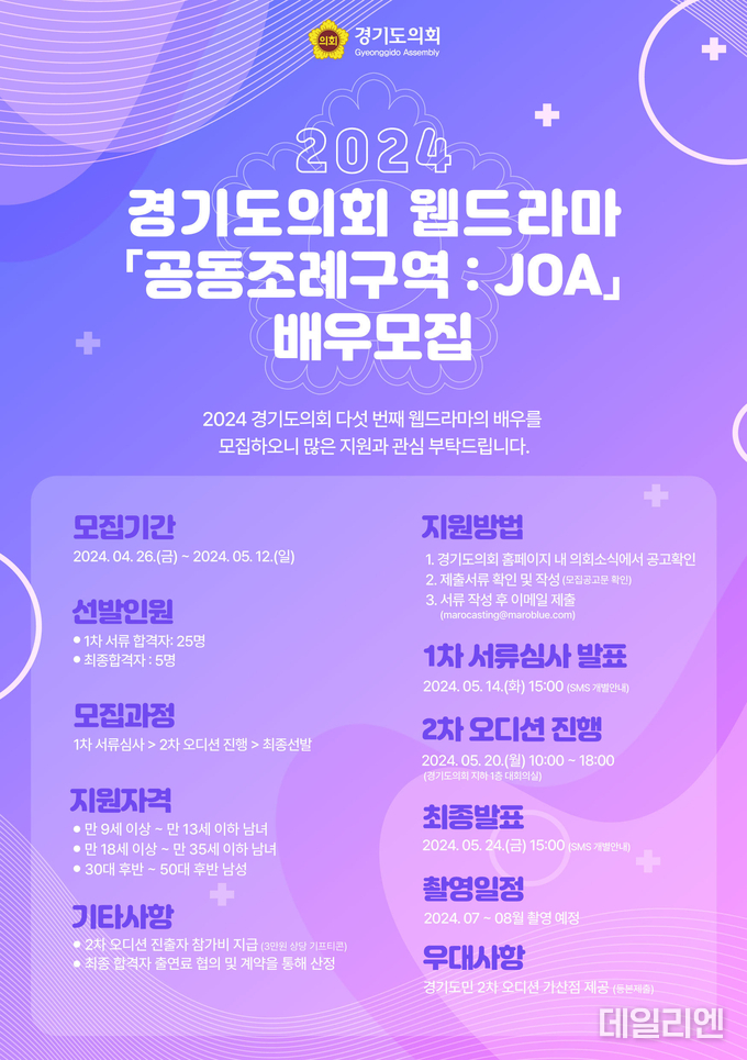 [데일리엔뉴스 이종성 기자] 경기도의회(의장 염종현)가 2024년도 경기도의회 웹드라마 「공동조례구역: JOA」의 도민 관심을 높이기 위해 배우 공개 오디션을 진행한다.