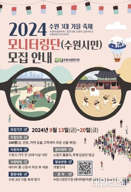 한편 수원시정연구원은 오는 13일부터 20일까지 수원시 3대 가을 축제 시민·외국인 공감모니터인단을 모집한다. 축제 모니터링단에 선정되면 소정의 활동비와 축제 입장권 등이 제공된다. 공감모니터링단은 19세 이상의 수원시민이라면 누구나 지원 가능하다. 지원을 희망하는 시민은 네이버 폼 신청서 작성을 하거나 연구원으로 문의 가능하다.