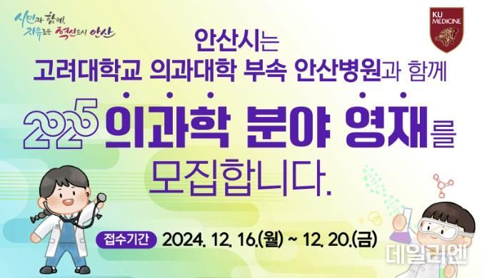 [데일리엔뉴스 이종성 기자] 안산시는 내년도 3월 고려대학교 의과대학 부속 안산병원과 손을 잡고 지역 내 창의적 인재를 양성하기 위한 ‘고려대학교 의과대학 부속 안산병원 영재 교육센터’를 개원한다고 9일 밝혔다.