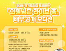 [데일리엔뉴스 이종성 기자] 경기도의회가 2026년도 웹드라마 ‘의원님은 라이브 중’에 출연할 배우 3명을 공개 오디션으로 선발한다. 도의회는 올해 제작하는 웹드라마 ‘의원님은 라이브 중’ 출연 배우 모집을 4월 28일부터 5월 8일까지 진행한다. ‘의원님은 라이브 중’은 무대에서 활동하던 트로트 가수가 도민의 대변인인 의원으로 변신한 뒤 의정 활동을 펼치는 과정을 그린 코믹 트로트 의정 드라마다. 모집 배역은 모두 3개다. 가수의 꿈을 가진 보육원 출신 자립준비청년 ‘상호’ 역은 20대 남성 배우를 대상으로 한다. 주인공의 열성 팬인 팬클럽 회장 ‘정희’ 역은 40~50대 여성 배우를 모집한다. 세상과 정치에 불신을 가진 채소가게 상인 역은 40~50대 남녀 모두 지원할 수 있다. 기성 배우와 신인 배우 모두 지원 가능하다. 오디션은 1차 서류 심사와 2차 현장 심사로 진행된다. 1차 서류 심사에서 15명을 선발하고, 합격자는 5월 14일 발표한다. 2차 오디션은 5월 19일 경기도의회 대회의실에서 열린다. 심사 항목은 이미지 적합성, 연기력, 창의력, 태도 등이다. 경기도민에게는 가산점이 부여된다. 2차 오디션 참석자에게는 소정의 기프티콘도 지급된다. 신