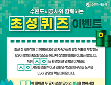 [데일리엔뉴스 이종성 기자] 수원도시공사(사장 이영인)가 기후변화 대응과 ESG 경영 인식 확산을 위해 SNS 초성퀴즈 이벤트를 24일부터 진행하고 있다. 이벤트는 기후변화 관련 문장에서 특정 초성을 맞추는 방식으로, 참여자는 정답을 댓글로 남기면 된다. 문제는 에너지 산업 변화와 환경 영향이 큰 ‘□ㅅ□ㅇ’의 친환경 전환이 ESG 핵심 과제임을 강조하는 내용이다. 참여는 공사 블로그, 페이스북, 인스타그램, 카카오톡 등 SNS 채널에서 할 수 있으며, 기간은 내달 3일까지다. 정답자 100명에게 음료 쿠폰을 지급하며 발표는 내달 8일이다. 이영인 사장은 “기후변화는 생태계 파괴와 질병 확산 등 사회적 문제를 초래한다”며 “시민 참여를 통해 기후위기 인식을 다시 환기하는 계기가 되길 바란다”고 말했다.